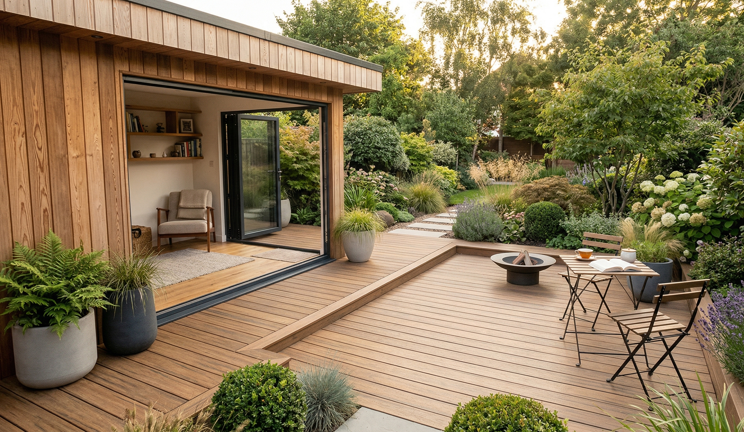 We can also incorporate a decked area to connect the garden room to the surrounding garden, creating a seamless indoor-outdoor space.